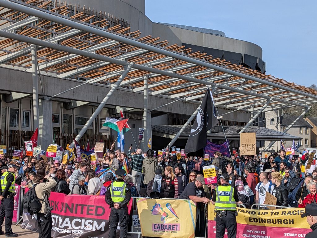 Anti-facists outside the Scottish Parliament on 21 March, 2026